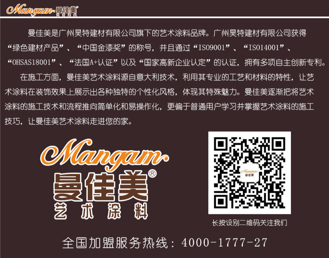 Mangam·曼佳美艺术涂料,创造出非凡的艺术盛宴,通过工艺与色彩的无穷变化,诠释了与众不同的高雅。Mangam·曼佳美艺术涂料提供优质的材料和先进的施工工艺及手法,让你随心装饰,发挥你独具一格的艺术创想。