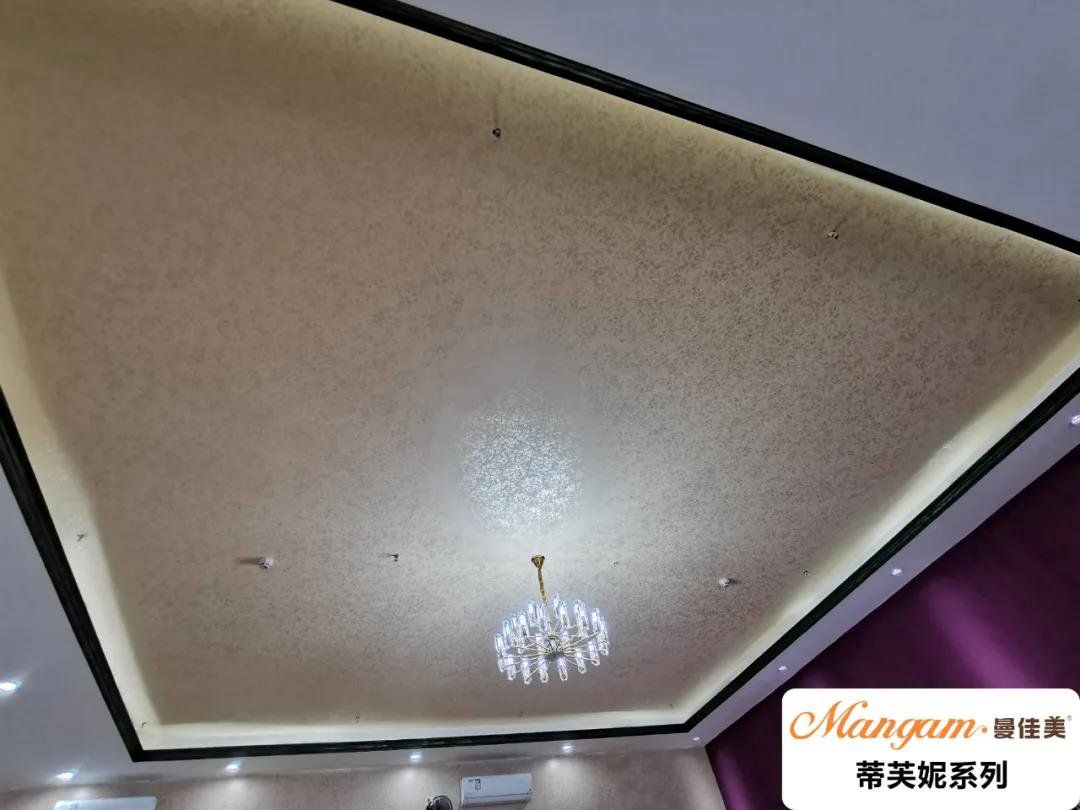 蒂芙妮系列在Mangam·曼佳美艺术涂料中是属于色彩丰富大胆的系列。传统的天花设计大多是白色为主调,再加简单吊顶造型。而蒂芙妮系列用不同底色和珠光面漆搭配组合涂装,形成风格迵异的花色造型,给人带来不一样的视觉感受。蒂芙妮系列,光鲜亮丽的色泽,随意创作的花色,给空间创造意想不到的惊喜。