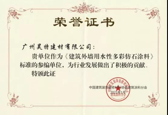 广州昊特建材有限公司作为建筑外墙涂料行业的佼佼者,受邀参与编制《建筑外墙用水性多彩仿石涂料》团体标准,并荣获了由中国建筑装饰装修材料协会建筑涂料分会颁发的参编单位荣誉。