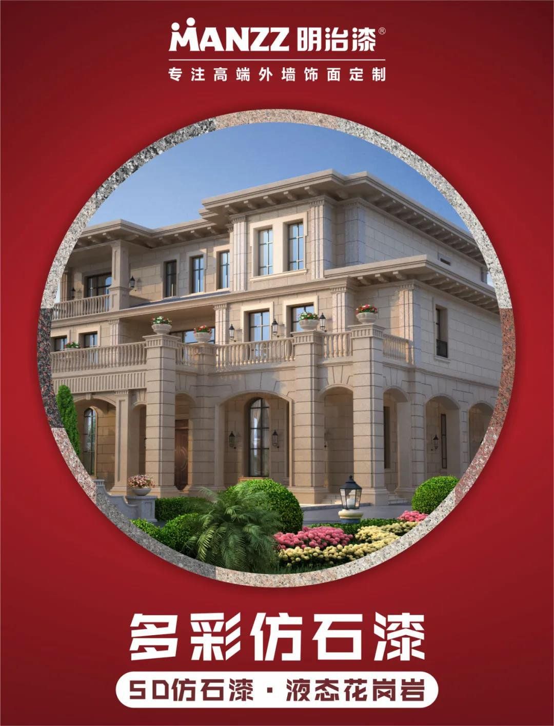 明治多彩仿石漆是由高耐候硅改性丙烯酸乳液、金红石钛白及功能性助剂等配制成的新型立体多彩石涂料。通过简单的喷涂,形成立体、斑斓、纹理生动的石材般质感涂层,体现建筑庄重、典雅、华贵的装饰效果,使用寿命长久。仿花岗石效果逼真,表面呈现石头质感,能最大程度实现各种石材在建筑装饰中的效果。