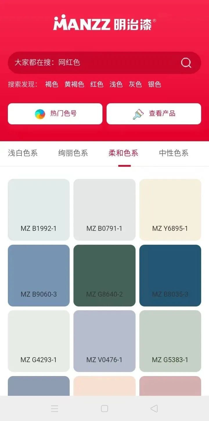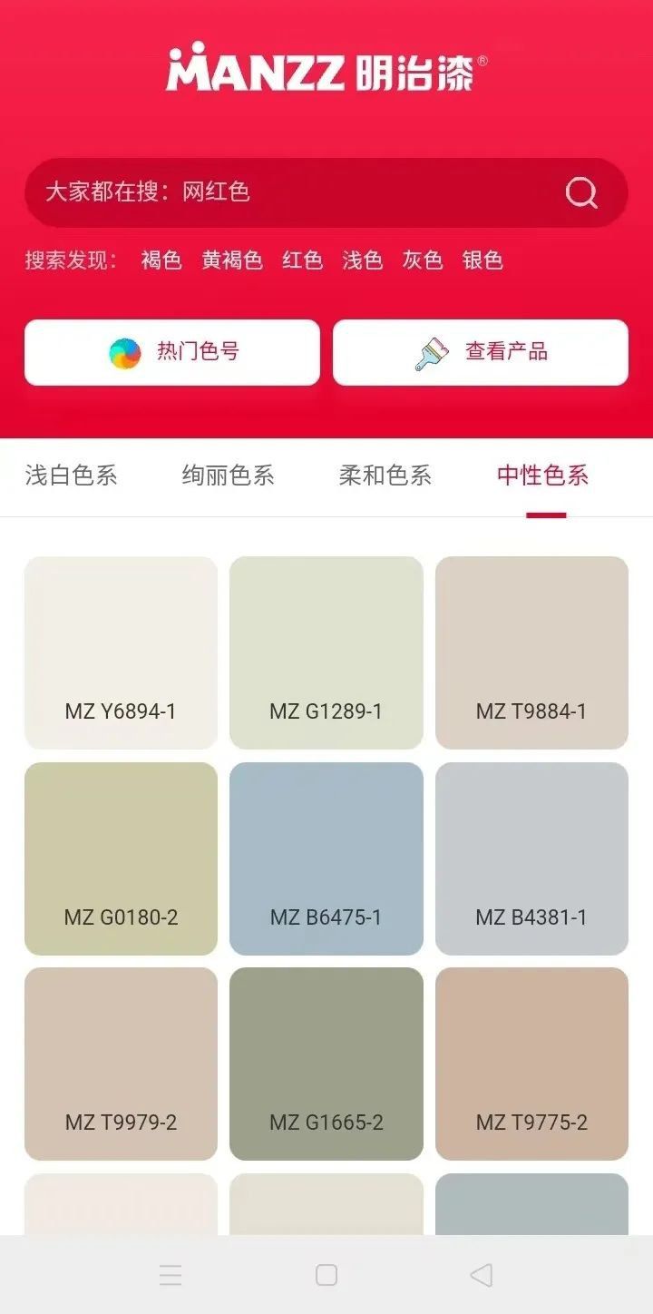进入电子色卡界面,选择主题色系,点击色卡进入详情页,轻松获取色卡编号、名称及RGB数值。