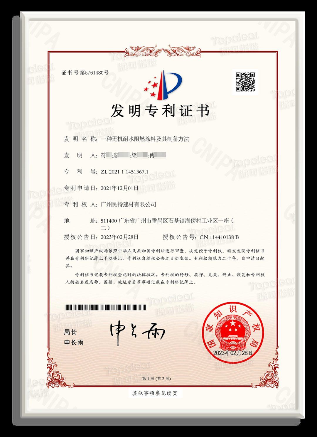 2023年3月期间,广州昊特建材有限公司的技术研发团队荣获了发明专利证书!