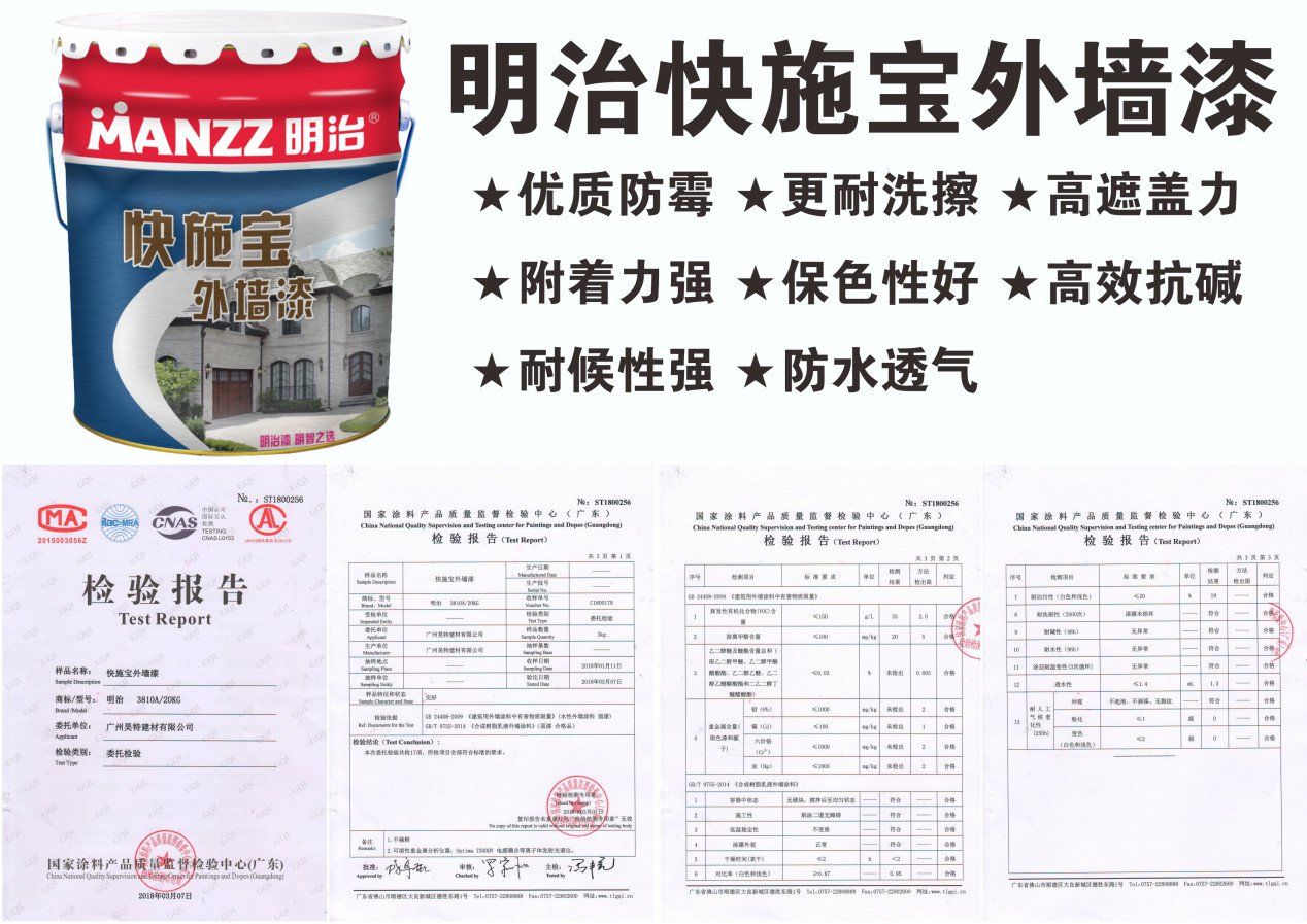 明治快施宝外墙漆特别为家庭、公共场所外墙装修而采用全新配方设计的高品质外墙漆。它具有手感细腻、漆面光滑平整、优质防霉、耐候性好、高遮盖力、施工便捷等诸多优良特点:而且它气味清新,还可以持久地保护您的墙面,不含有害物质,即使在施工过程中,不会威胁到您的健康。