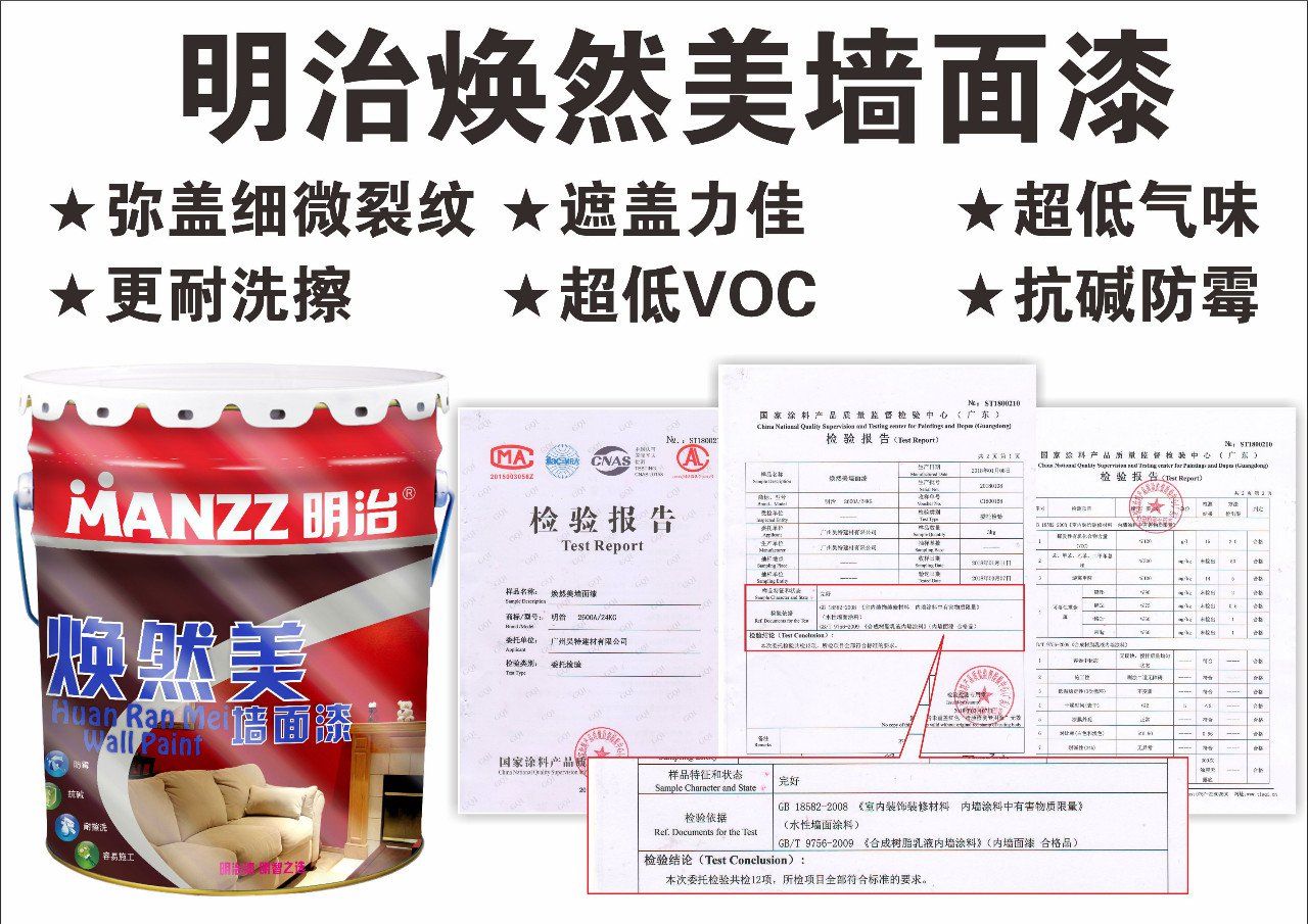 明治焕然美墙面漆是一款特别为家庭、 公共场所设计的高档内墙墙面漆。它具有白度高,手感细腻、漆面光滑平整、耐擦洗、优质防霉、高遮盖力、施工便捷等诸多。优良特点;而且它气味清新,不含有害物质,即使在施工过程中或进入刚粉刷过的房间,也不会对您的健康有任何损害,更进一步呵护您家人健康成长。