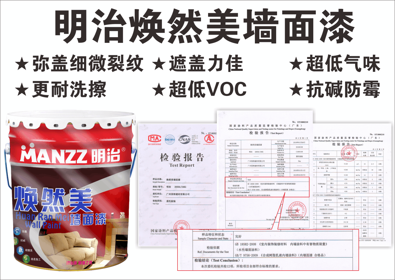 明治焕然美墙面漆是一款特别为家庭、公共场所设计的高档内墙墙面漆。它具有白度高,手感细腻、漆膜光滑平整、耐洗擦、优质防霉、高效抗碱、遮盖力佳、施工便捷等诸多优良特点;而且它气味清新,不含有害物质,即使在施工过程中或进入刚粉刷过的房间,也不会对您的健康有任何损害,更进一步呵护您家人的健康成长。