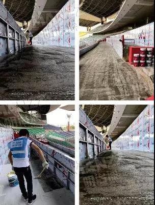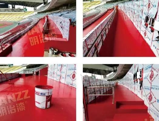 该翻新涂装工程使用了明治水性环氧封闭渗透底漆和明治水性丙烯酸地坪漆来进行广州奥林匹克体育中心翻新涂装。