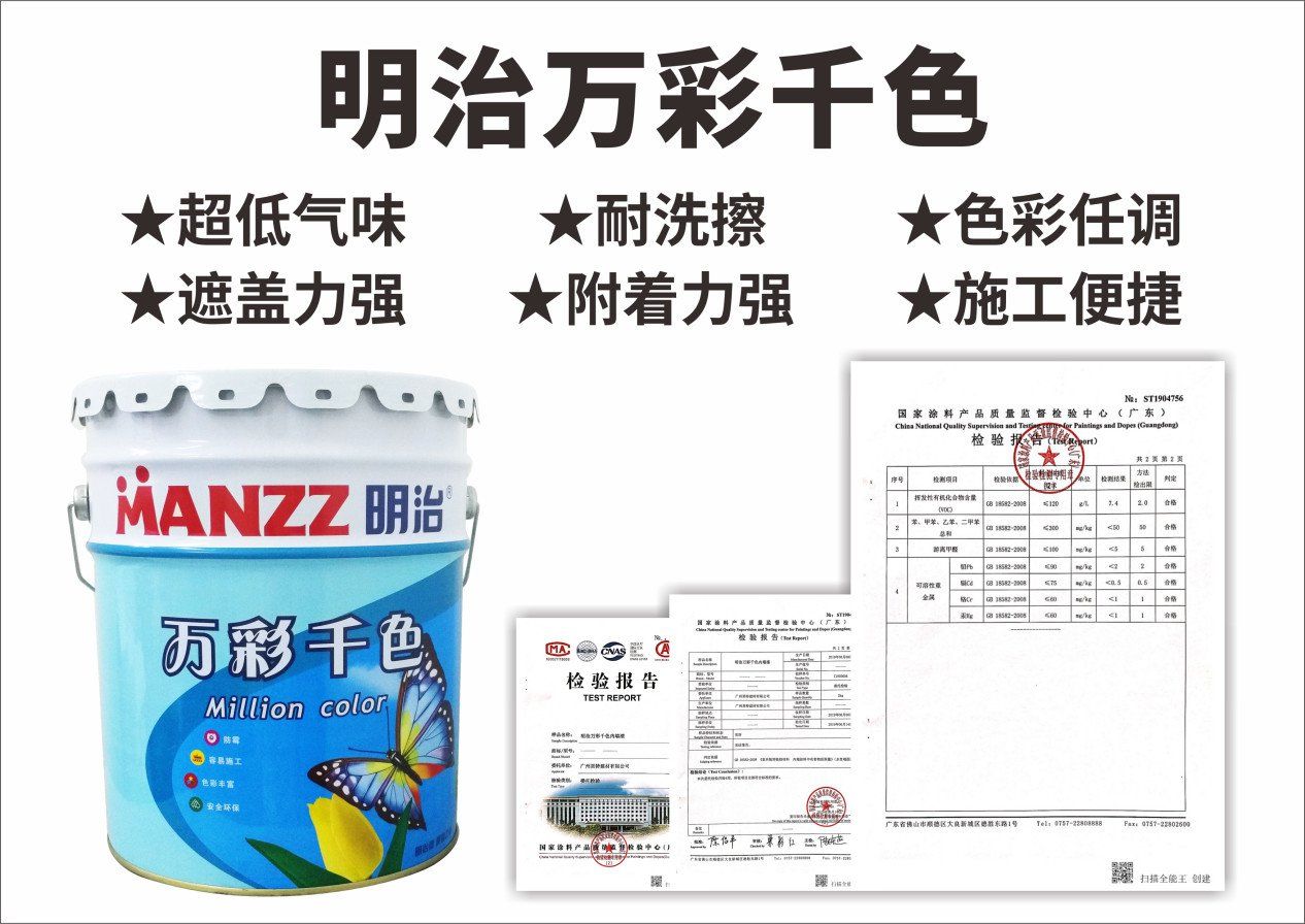 明治万彩干色有超过1000多种五彩缤纷的颜色供您选择。它不仅为您家居增添美丽柔和的色彩,更能体现您与众不同的个性。明治万彩千色漆具有防霉抗碱的特性;有很强的附着力和良好的遮盖力;涂刷方便,易于清洗。