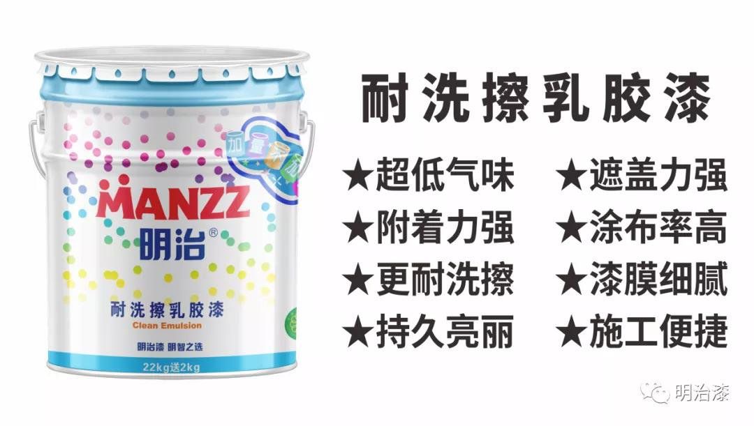 明治耐洗擦乳胶漆特别为家庭、公共场所内墙装修而采用全新配方设计的高档内墙装饰乳胶漆。它具有手感细腻、漆面光滑平整,耐擦洗、高遮盖力、施工便捷等诸多优良特点;而且它气味清新,不含有害物质,即使在施工过程中或进入刚粉刷过的房间,也不会对您的健康有任何损害。