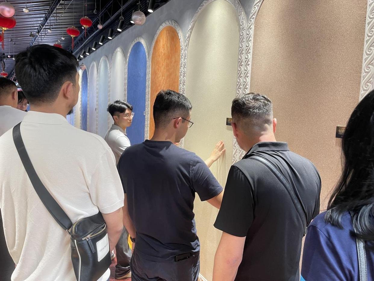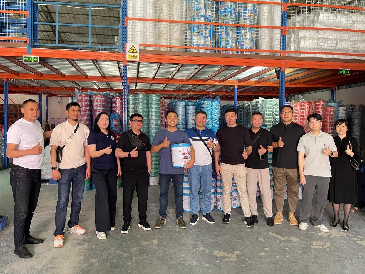 哈萨克斯坦BI GROUP集团一行先后参观了我司生产车间、成品及原料等仓库、产品研发实验室、艺术涂料展厅等。在技术应用廖主管讲解下,了解了我司厂区的各类生产产品具体情况。