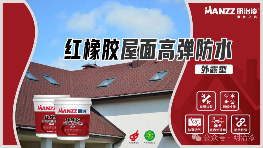 明治红橡胶屋面高弹防水(外露型)适用于混凝土屋面、金属屋面、琉璃瓦屋面等天面防水工程,也适用于外露的混凝土外墙防水处理。